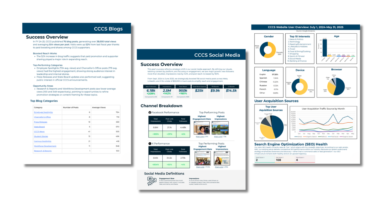Compiled year-end insights for CCCS marketing and communications, analyzing blog performance, social media engagement, and web traffic trends across all digital channels. Summarized top content drivers, audience behavior, acquisition sources, and SEO health to help leadership understand impact and identify opportunities for continued growth.