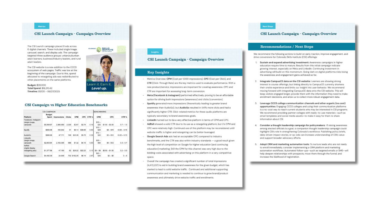 Summarized launch campaign performance for the Colorado Skills Institute, which placed eight ads across six digital channels targeting adult learners and business audiences. The campaign generated more than 4.47 million total impressions, driving meaningful awareness for a new statewide initiative and early web traffic for the recently launched CSI site. Platform performance was benchmarked against higher-education norms, highlighting Meta and LinkedIn as strong cost-efficient drivers of engagement and identifying next-step opportunities to continue building momentum.